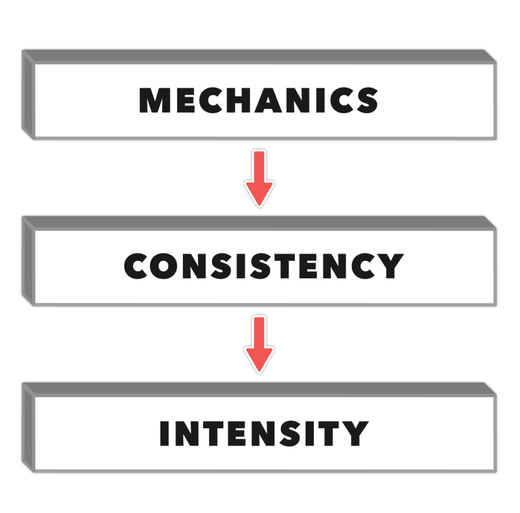 Seulement quand l’athlète sera capable d’effectuer un mouvement avec une bonne mécanique et ce, malgré un grand nombre de répétitions et la fatigue, on pourra le challenger un peu plus en augmentant l’intensité. Mais pas avant. Pour augmenter l’intensité, on pourra lui demander d’augmenter le volume de répétitions, la vitesse ou la charge.